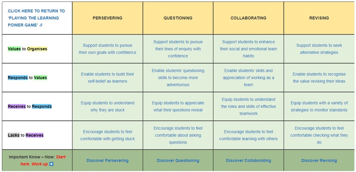 This complementary resource takes a leadership perspective for Phase 2 of developing students’ learning power. It’s designed to offer you as a leader a view of the strategic concerns that will arise when the school takes on ‘The Professional Learning Power Game‘
