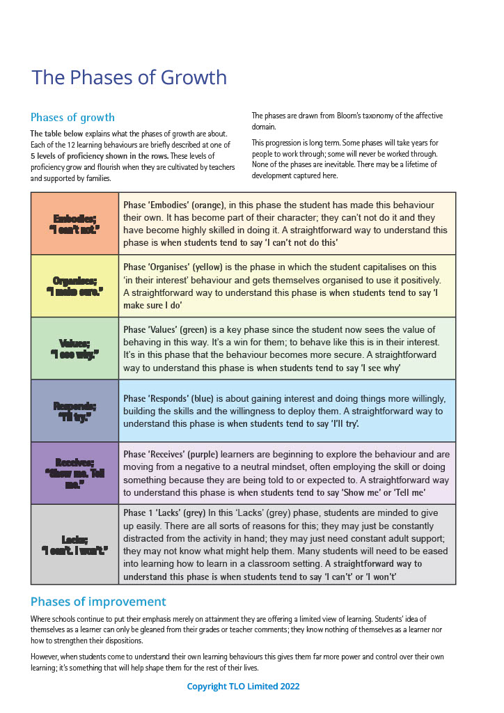 The other 11 learning behaviours in phase 2 have their own, richer progression charts. These guide teachers to better understand and coach the complex states and stages of development.