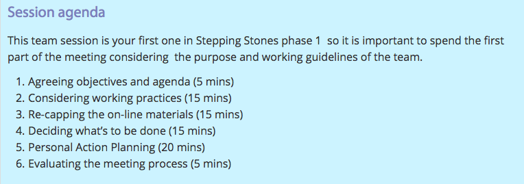Team sessions are built into every unit of the online programmes. These sessions are carefully structured and timed to ensure the main purposes of the meeting are accomplished. This structure and timing isn’t a casual stab in the dark but is informed by significant research into such groups.