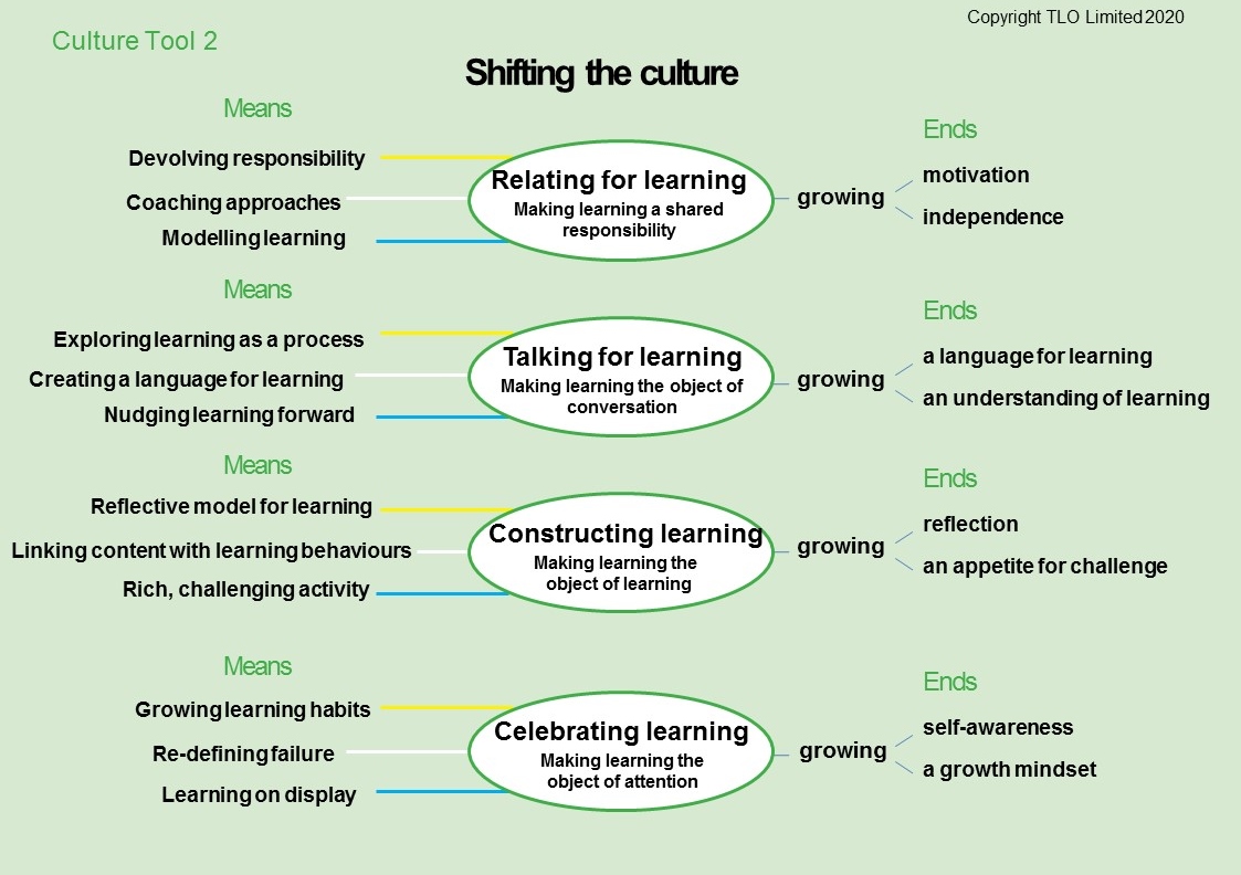 The learning culture wheel is made up of the four aspects of culture depicted in four shades of green: