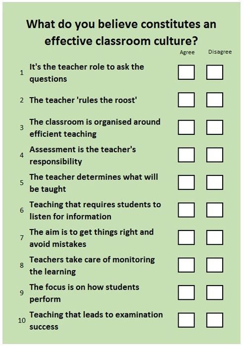To tune you in to the current concerns about the role of the teacher take a quick look at this apparently simple quiz. Each statement uncovers a layer of debate about the role of a teacher and the culture of the classroom they manage. Think beyond your first reaction before deciding what the statement may be looking at and where you might currently stand.