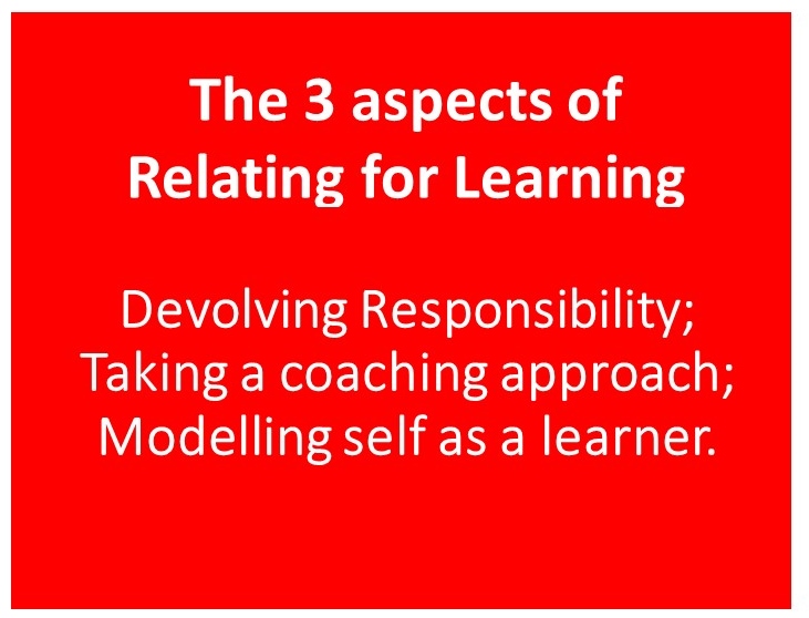 Relating for learning is about developing the roles and responsibilities of teachers and learners such that learning becomes a shared responsibility. Students are given more responsibility for their own learning, the role of the teacher changes from ‘the sage on the stage’ to ‘the guide by your side’; the role of the student moves from ‘passenger’ to ‘crew’ and ultimately to ‘pilots of their own learning’.