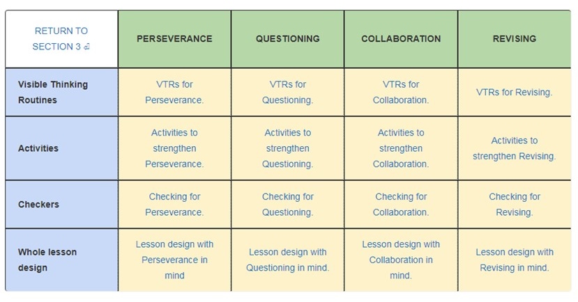 The programme introduces the holistic ideas of learning power and helps teachers adapt their classroom culture and lesson design in order to grow positive dispositions in four foundational learning behaviours: Perseverance, Questioning, Collaboration and Revising.