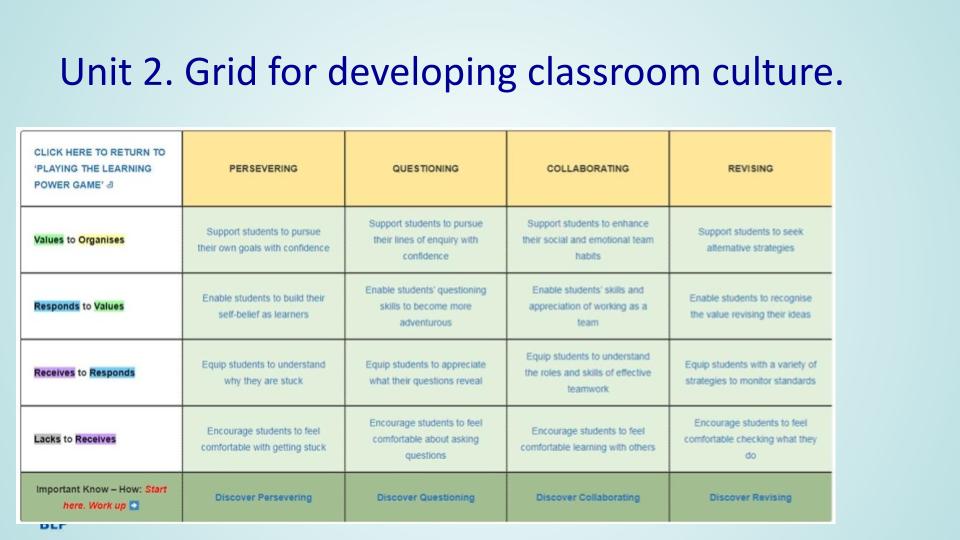- Unit 4 two months, encourages teachers to branch out and introduce more learning behaviours , with two learning team meetings.