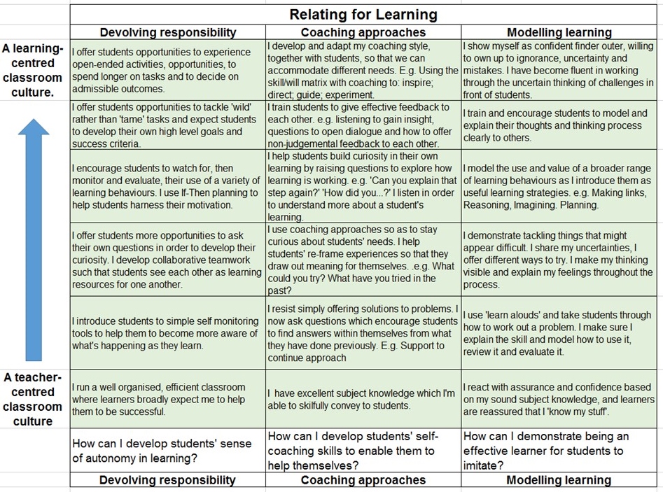 Here we consider the three aspects of Relating for Learning – Devolving Responsibility; Coaching approaches; Modelling learning – and begin to explore how each might change as the classroom becomes increasingly learning friendly.