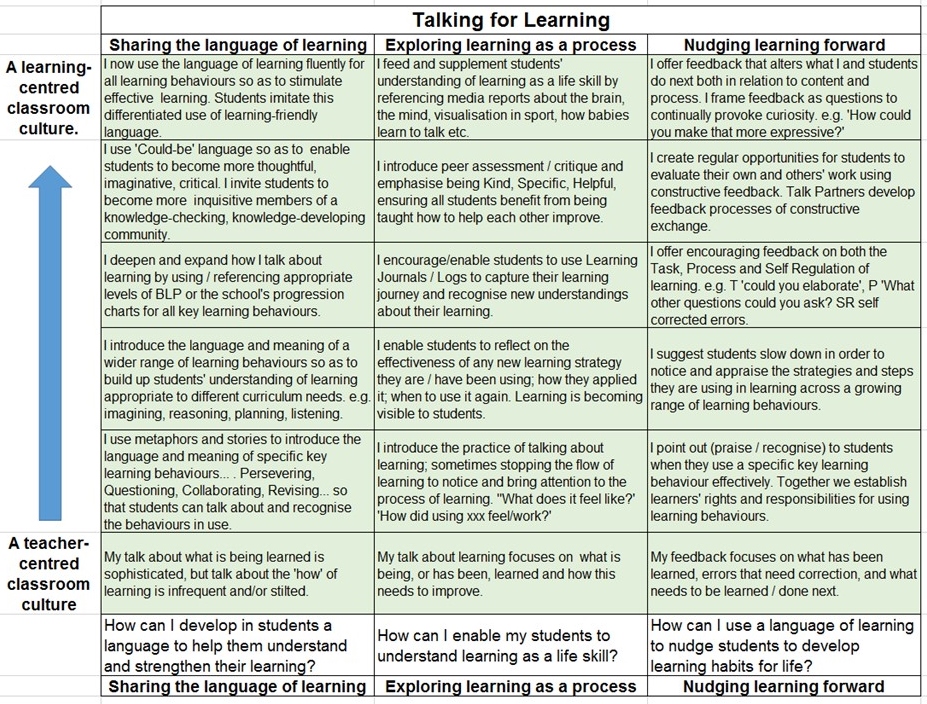Here we consider the three aspects of Talking for Learning – Sharing a language of learning; Exploring learning as a process; Nudging learning forward – and begin to explore how each might change as the classroom becomes increasingly learning friendly.