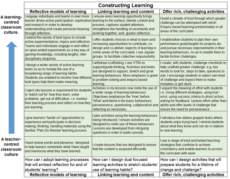 Here we consider the three aspects of Constructing Learning – Reflective models of learning; Linking learning and content; Offering rich, challenging activities – and begin to explore how each might change as the classroom becomes increasingly learning friendly.