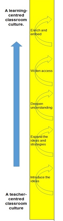 Here we try to capture a sense of progression in teachers’ practice. At the foot of the column lies a description of a traditional classroom where the power and responsibility for learning lies solely with the teacher. At the top of the columns lies a brief description of a full-on learning-friendly, learning-centred classroom. Reading across the tops of the columns gives a clear picture of the practice teachers are ultimately aiming for. The cumulative steps in between describe the journey and how it changes in focus. In the early stages you are probably dealing with a carefully chosen but limited set of learning behaviours. Later you will add more learning behaviours to your range, increase your skill and fluency and turn your attention to helping the students use and benefit from the same ideas. [These ‘early stages’ were explored as teachers worked with ‘Playing the Learning Power Game’. The programme ‘Playing the Deeper Learning Power Game’ will help teachers to access the upper rows of the progression chart.]Take a look at the stages of growth pattern
