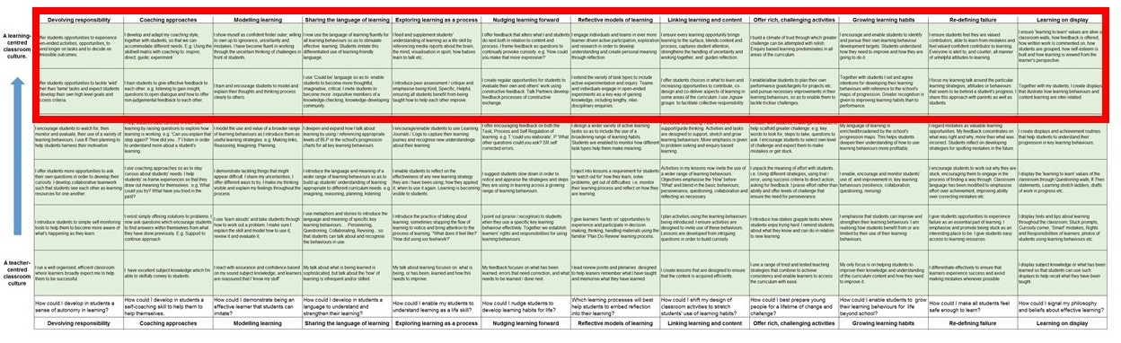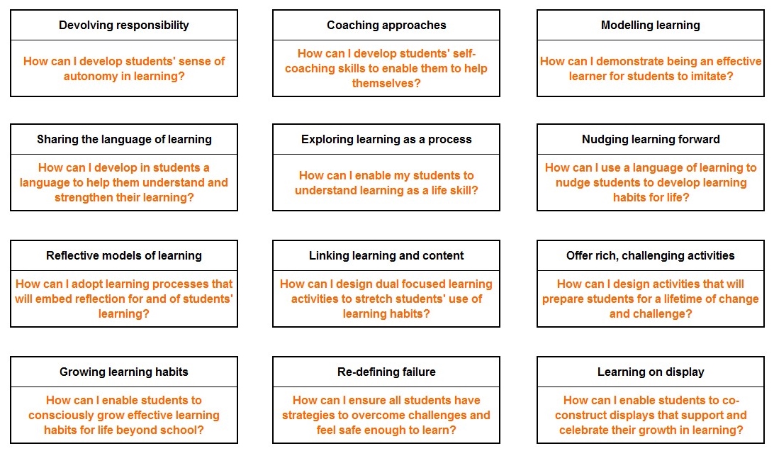 Each column has a simple label such as ‘Devolving responsibility’ or ‘Linking content and process’ that denotes the job to be done. The job to be done is followed by the question ‘How can I develop students’ sense of autonomy?’ ‘How can I design dual focused learning activities to stretch students’ use of learning habits?’ The questions explore what has to be done and for what reason. In other words the orange questions uncover why you are making these changes; in order to do what; in order to achieve what? This thrust of what, how and why has helped teachers keep hold of the bigger purpose as they try out and perfect the small practical ideas on a daily basis.Take a look at the what and how of jobs to be done.