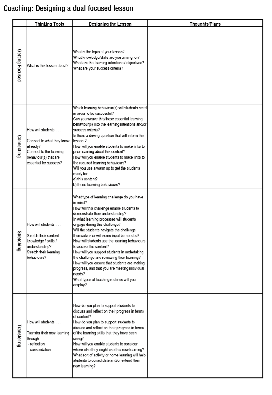After a significant input on a method of designing dual focused lessons (content and process) staff are invited to form a coaching pair and, with the help of prompts, coach each other to apply the 9 Thinks approach to a lesson they have taught recently or are about to teach. Pairs made up of teachers from different phases might be most interesting.
