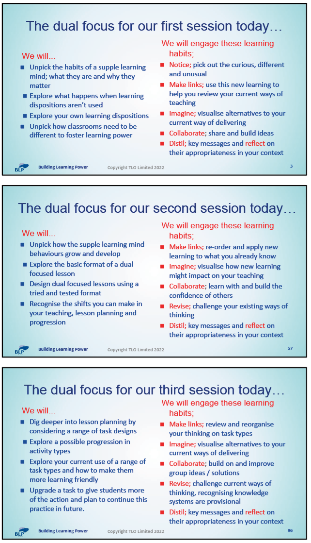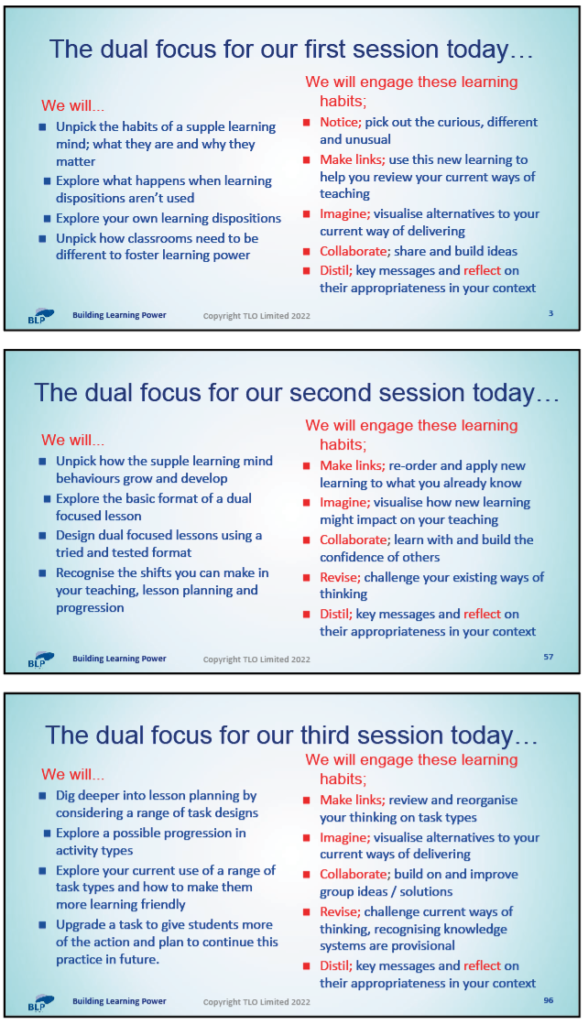 The full day training has been constructed as a result of discussions with Andrew Toovey, Director of Teaching and Learning. It is designed to briefly remind or introduce staff to the two frameworks that underpin Learning Power, and then moves on to the more practical skill of designing lessons that engage students’ learning power. The sessions look at the growth of learning behaviours, a plan for incorporating them into lessons and a close-up dissection of task design. Alongside the theory and practice we have added complementary examples and stories from schools to show how the ideas actually work in the field.