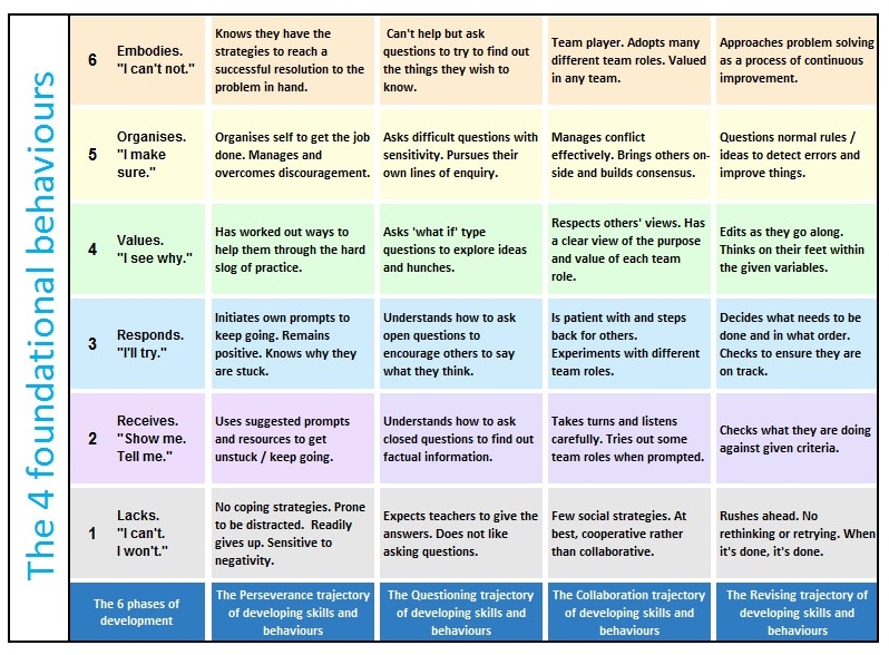5.1 Having been given a set of 28 mixed up cards staff are invited to discuss and build their own trajectories for the 4 key learning behaviours with 7 in each column.