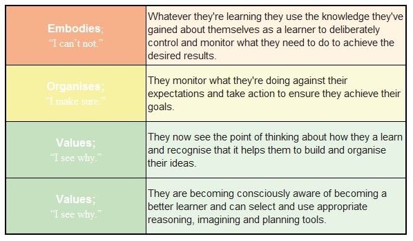 In the Values (green) phase, students are aware of how their learning is growing and they are careful to capture this new awareness in drafts or models or trial artefacts. They are moulding their environment to meet their needs and their enthusiasm helps them to keep going and manage distractions. They are using a wide variety of learning methods and value the opportunity to discuss things with others. They are consciously aware of keeping all these elements on track.