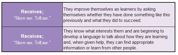 In the Receives (purple) phase, students are aware of what interests them and how to find information. They know that some surroundings are better than others for learning and that they can learn from other people. They are showing an interest in learning and enjoy finding out about lots of things.