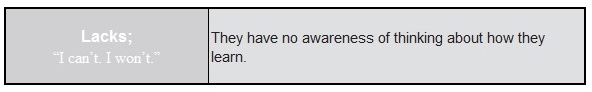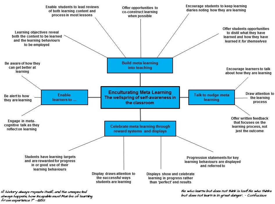 Becoming a meta-learner is about being able to assess the effectiveness of your own learning process and regulate it for greater success. It has several strands; how you become and stay motivated and plan your learning, how you build and organise your ideas; how you learn with and from others; how you manage your learning environment and how you monitor your learning process itself in order to improve. When looked at from these diverse angles, growing meta-learning moves well beyond encouraging a student to ‘think about your learning’.