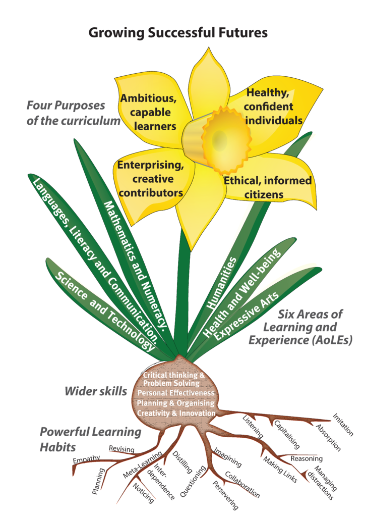 LHS text Ambitious, capable learners; enterprising, creative contributors; ethical, informed citizens; healthy, confident individuals. Sometimes these ambitious purposes sound too grand and vague to get a practical handle on but the behaviours in the learning power framework can help to underpin and clarify. Being Capable, Creative, Informed, Confident, for example all require good questioning skills. Being ambitious, enterprising, ethical and healthy all draw on the ability to draw on multiple perspectives and see the world from other people’s eyes (empathy). In this way the same learning habit can contribute to several ‘high order’ competencies’. By the same token each wider skill is itself a composite. Take the wider skill of Creativity and innovation. Research suggests that becoming a creative thinker involves being able to notice details and patterns, taking risks, questioning and playing, learning by imitating others, revising your ideas, and imagining possibilities. Each of these is treated in the Supple Learning Mind framework (see above) as a separate learning behaviour, each of which is capable of being stretched and strengthened. Thus learning dispositions make explicit and coachable the very foundations of those qualities of mind the new curriculum for Wales is trying to secure. They form the very roots of learning, enabling students to develop wider skills throughout the programmes of study and experience and the flowering of the four purposes.Title