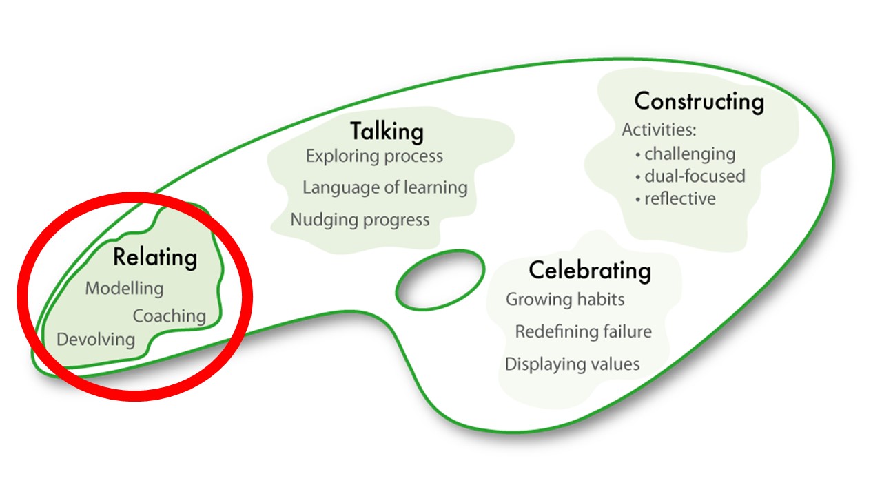 The green cells across the bottom give an outline of how the teacher’s role develops as they make changes in how they relate and talk to learners and how they construct and celebrate learning. Hovering over each cell gives more detail. The blue cells to the far right give an indication of the anticipated outcomes for learners in terms of the 4 important learning behaviours and hovering over each cell suggests what you might look for in students. As you hover over these cells, you will gain a sense of what you might look out for in terms of classroom culture and student learning behaviours.