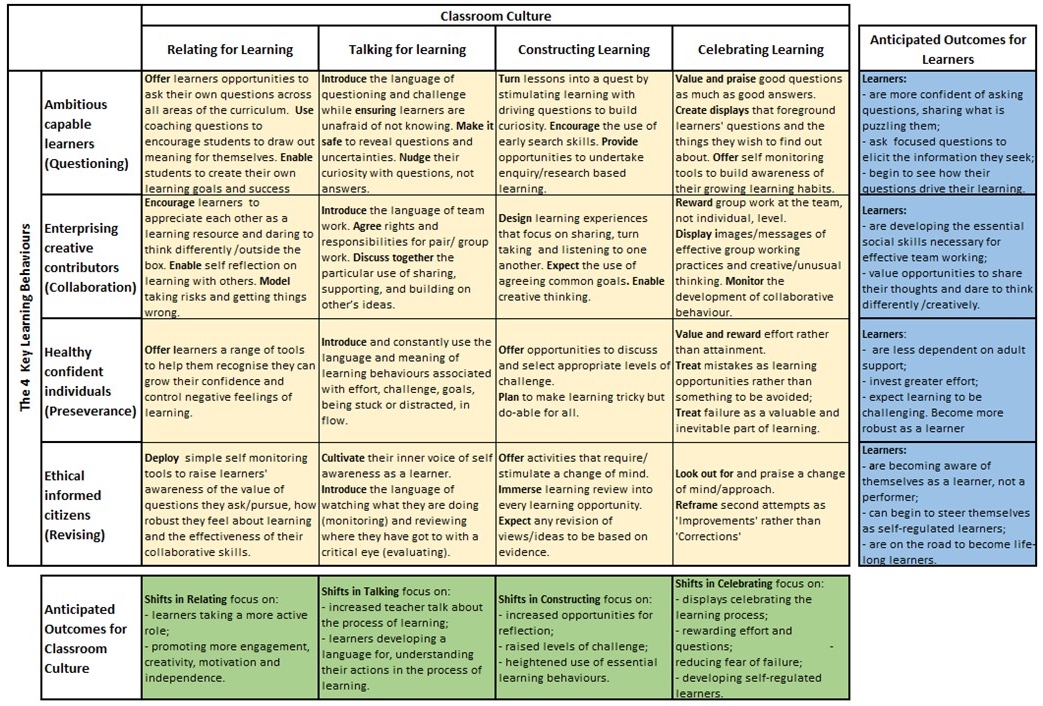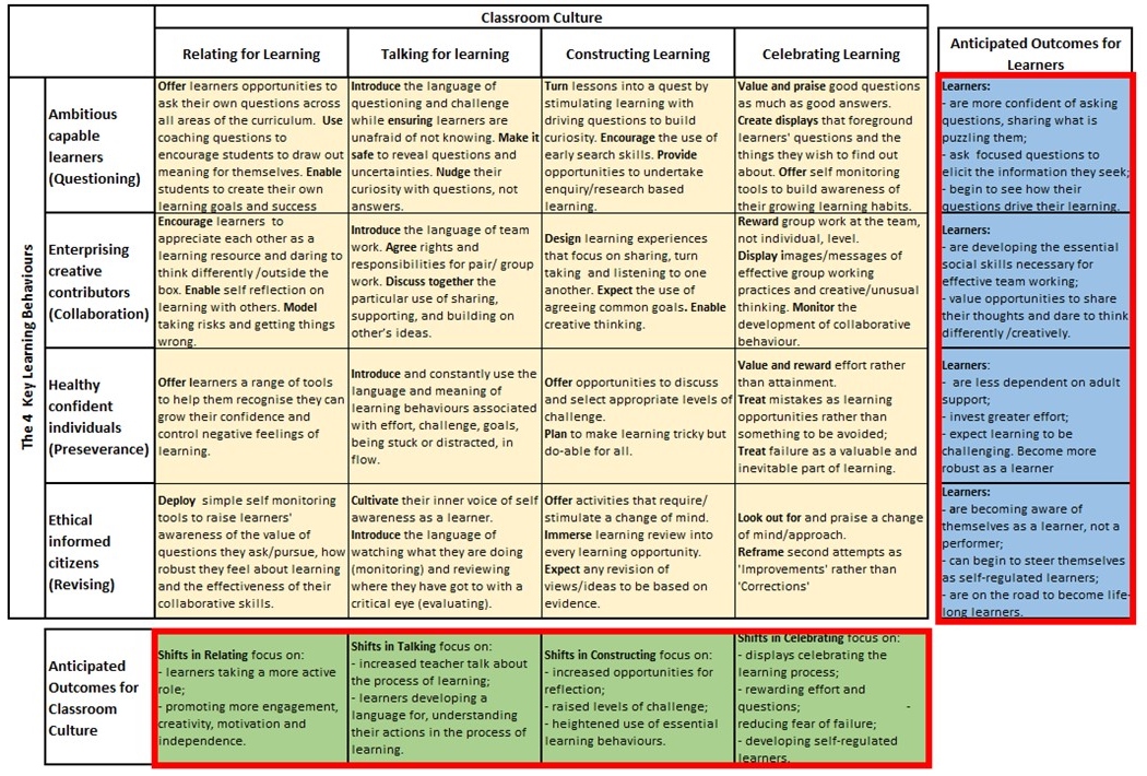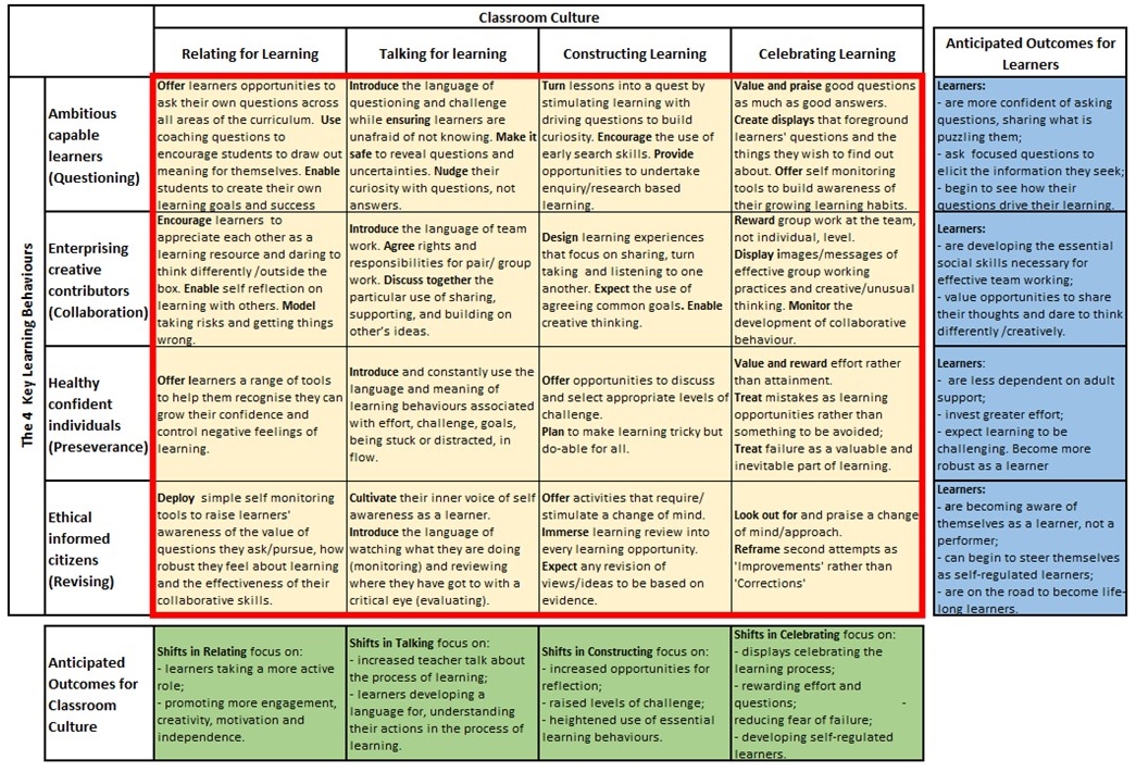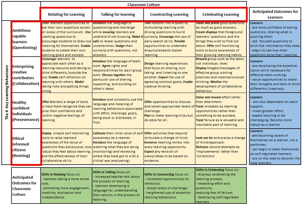 - When looked at horizontally across the page, they hint at the ways in which classrooms need to change to enable the 4 key learning behaviours to flourish.