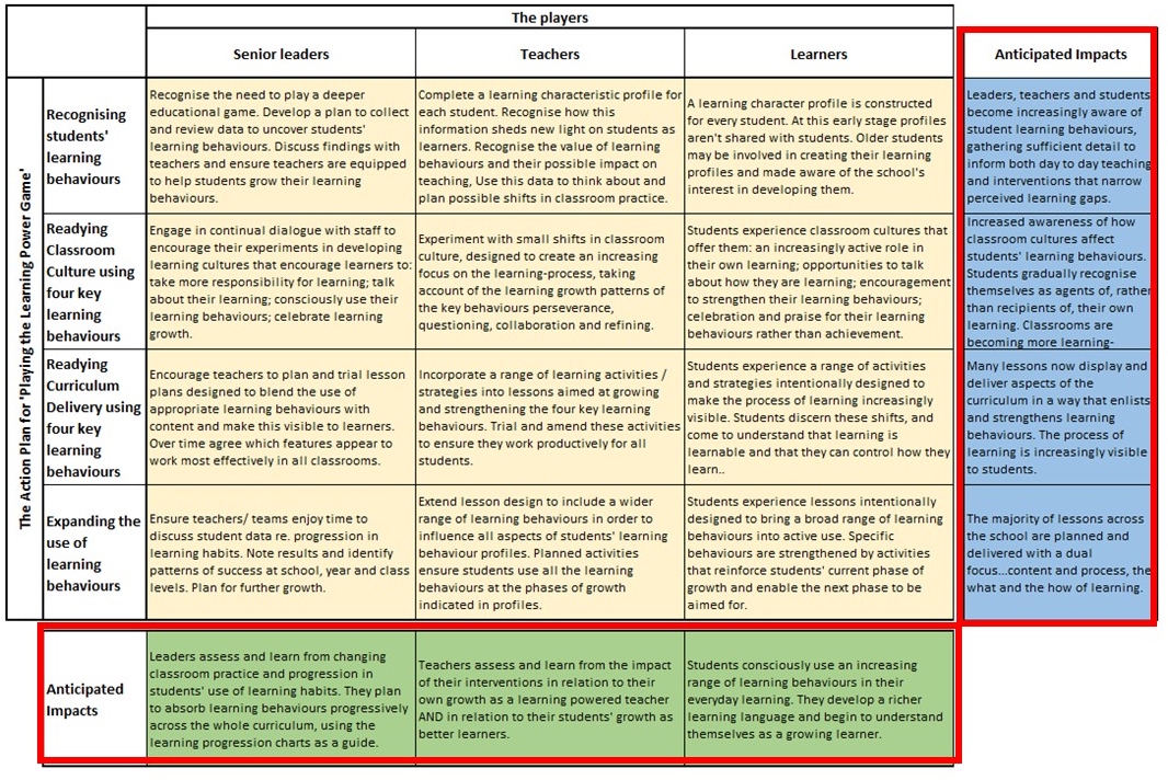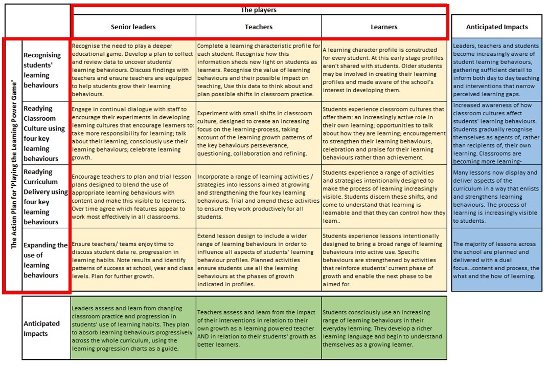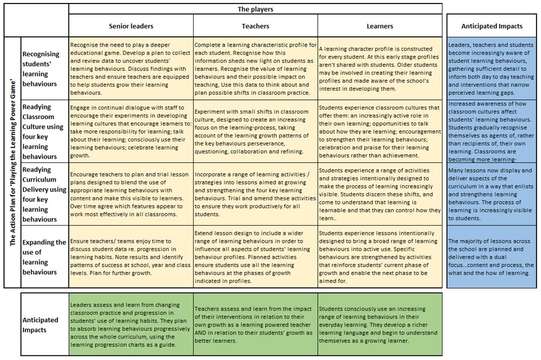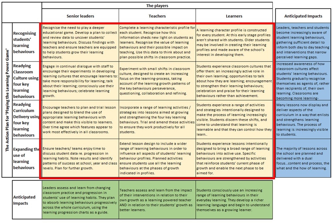 The green cells across the bottom give an outline of how the school’s players will have developed by the time you have finished this first stage course. The blue cells to the far right give an indication of the anticipated outcomes for each part of the journey from; discovering students learning behaviours, to shifts in classroom cultures to support their growth, to early shifts in lesson design accommodating learning behaviours, to the beginning of using a much broader range of learning behaviours across the curriculum.