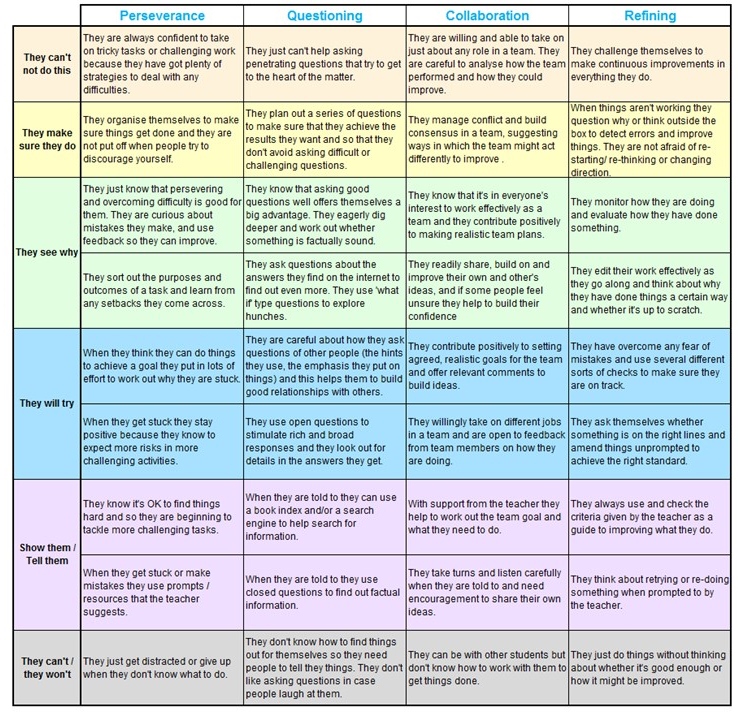 - examples of things to try out with your learners to enhance perseverance, questioning, collaboration and revising;